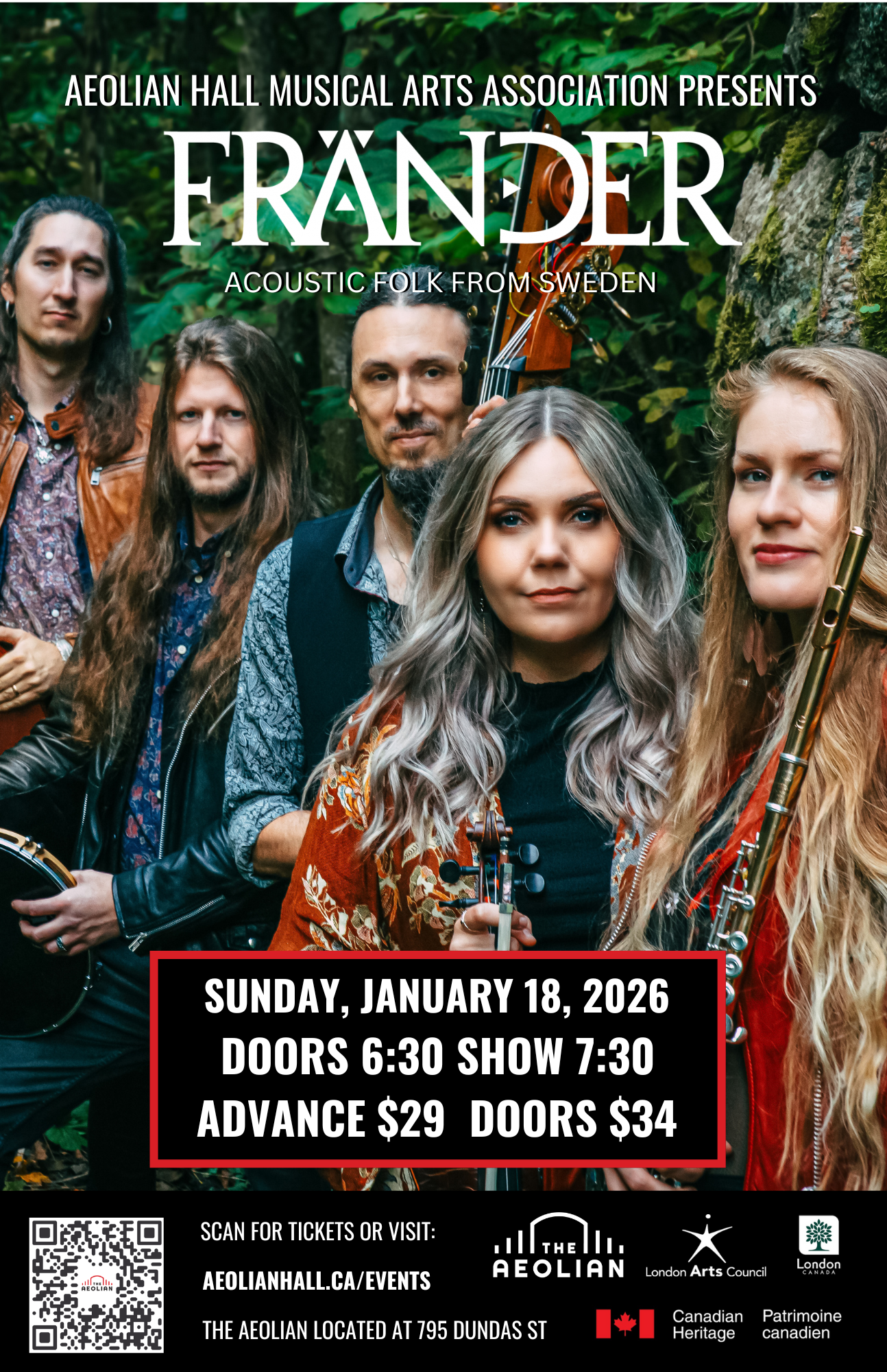 The band’s current tour lineup features founding siblings Gabbi Dluzewski (Swedish mandola and vocals) and Daniel Dluzewski (double bass and vocals), playing alongside Gabbi’s wife Säde Tatar (flute and vocals), the percussionist expert Andreas Berglund (specialized on Japanese classical marimba), and the stellar fiddler and family friend Gabriella Josefsson. On their most recent album, II, FRÄNDER continues to redefine the future of European music.