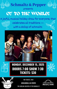 From klezmerized Christmas classics to brand-new Hanukkah tunes, enjoy Schmaltz & Pepper’s signature blend of virtuosity, laughter, and heart in a festive concert that celebrates all traditions —with a dollop of schmaltz.