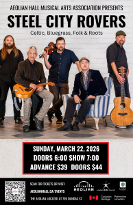 The Steel City Rovers perform dynamic and expressive music that is a unique composite of traditional Celtic music and North American styles including bluegrass, folk and roots. Their original works touch on issues of love, loss, celebration and heritage and they also breathe life into newly-discovered instrumental melodies from as far back as centuries ago. Their sophisticated arrangements are inviting for the most casual listener but are rewarding for those who are well versed in the nuances of musical complexity. The Rovers stand out for their powerful, emotive vocals and engaging entertainment. They perform on meticulously crafted replicas of historical instruments that rarely appear on today’s musical landscape. This highly active touring band headlines large festival stages, gives intimate concert performances, educates in a variety of workshop and master-class settings and performs internationally with symphonies. They create, collaborate and work hard to further the love and awareness of music.
